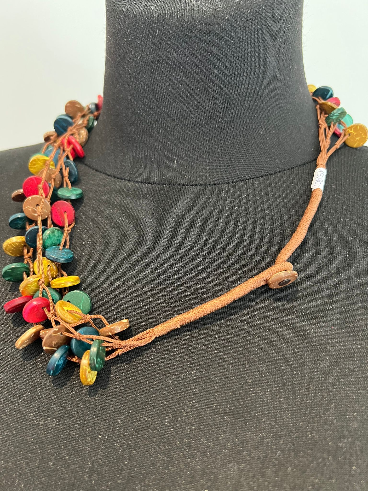 Schöne leichte Holzkette – optisch wie Knöpfe – mehrlagig aufgemacht wie auf den Fotos zu sehen am Ende zusammenführend zum Schließen